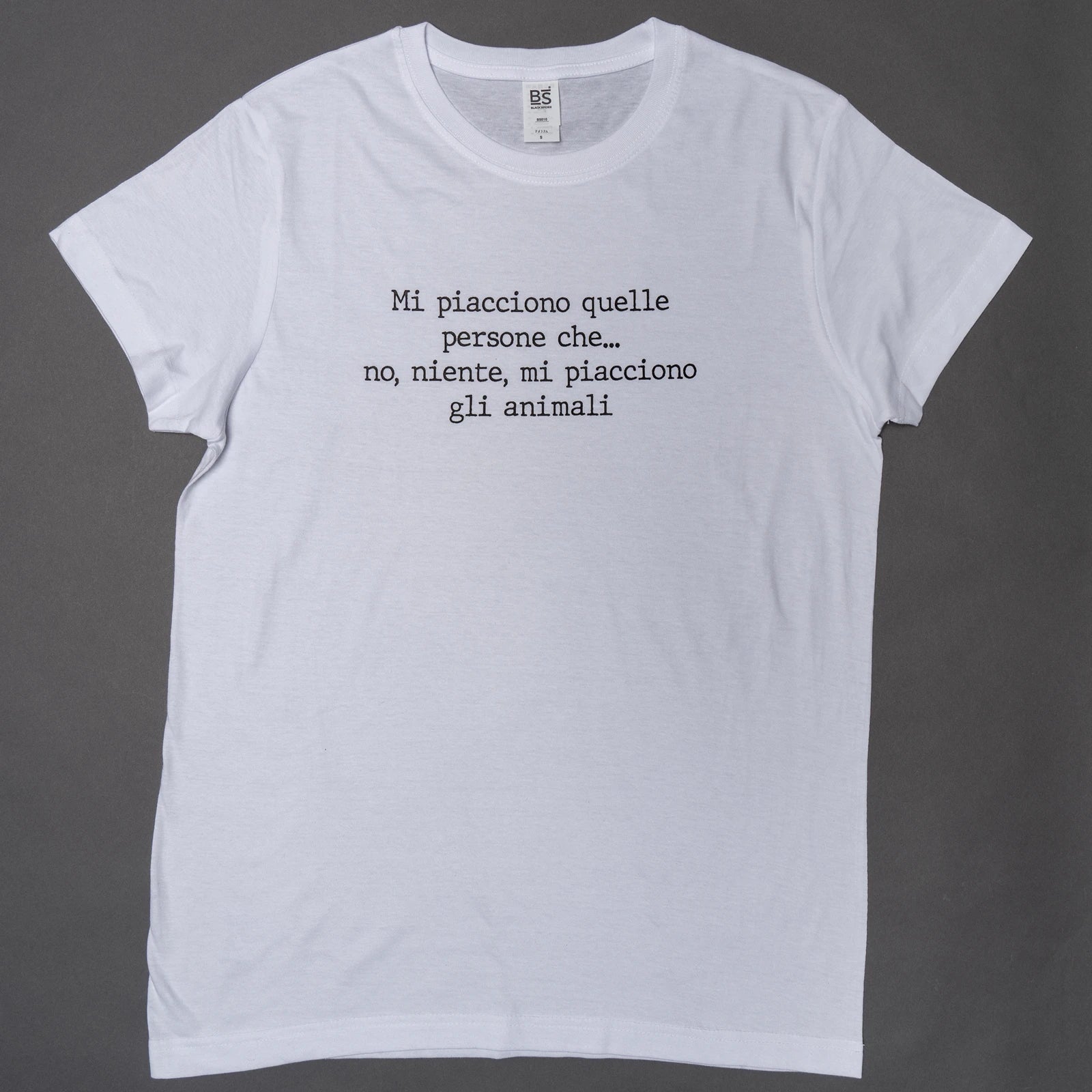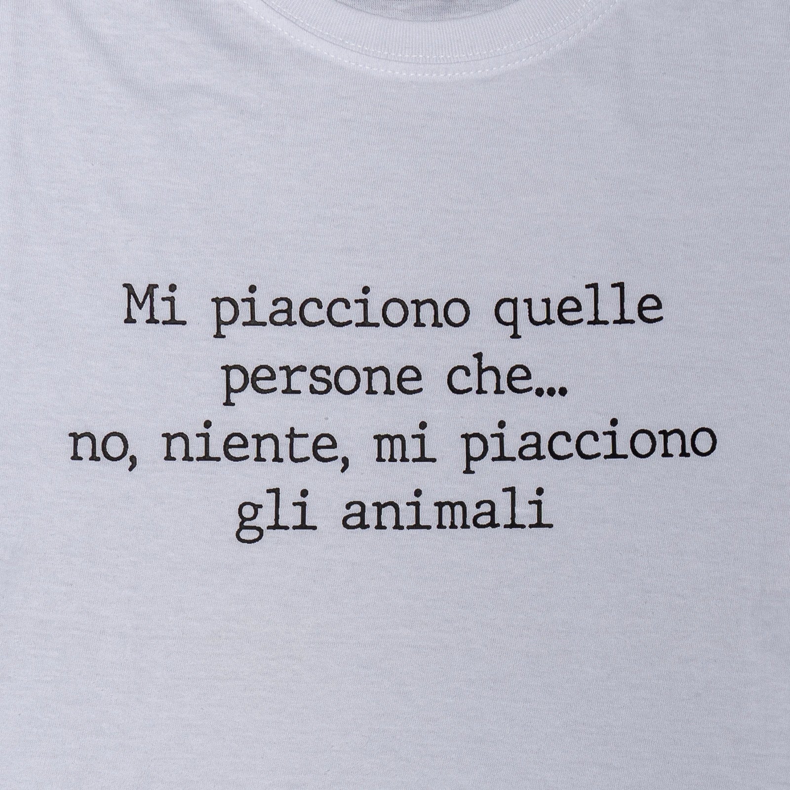T-Shirt realizzata al 100% in cotone, offre un comfort eccezionale e una vestibilità leggera. Di colore bianco, è un capo versatile che si presta a innumerevoli abbinamenti. La scritta "MI PIACCIONO QUELLE PERSONE CHE... NO, NIENTE, MI PIACCIONO GLI ANIMALI!" cattura l'attenzione con il suo messaggio spiritoso e affettuoso, perfetto per gli amanti degli animali. Firmata dall'artigiano CALZESPAIATE, questa maglia unisce qualità artigianale e un tocco di umorismo, rendendola ideale per chi desidera esprimere la propria passione per gli animali in modo originale. Perfetta da indossare con jeans o pantaloni casual, è un capo che non passerà inosservato!