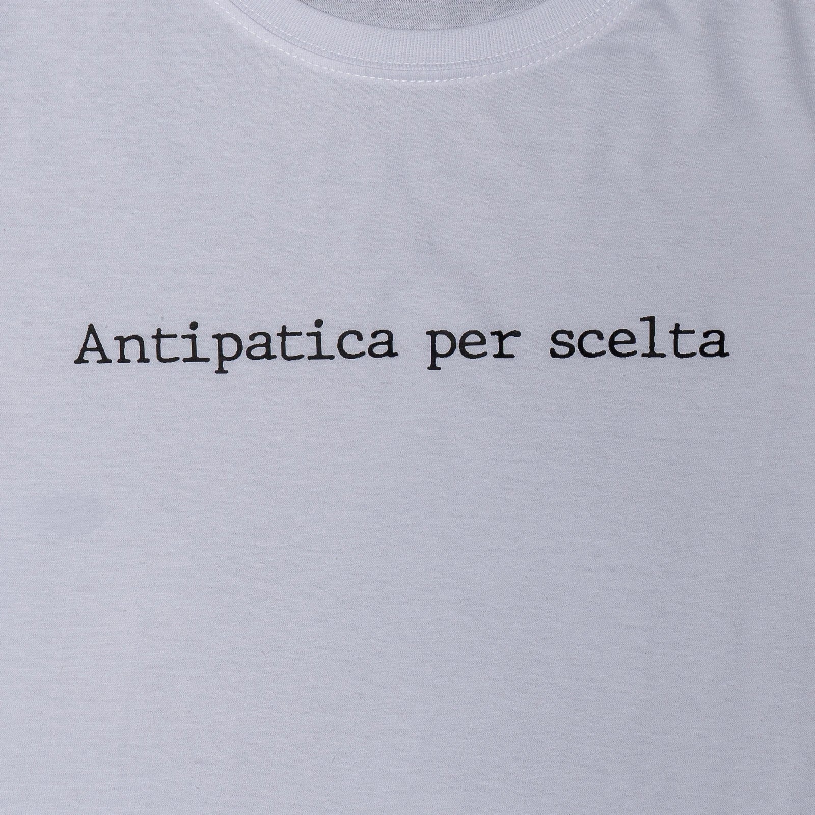 T-Shirt realizzata al 100% in cotone, garantisce una sensazione di freschezza e comfort. Di colore bianco, offre un look pulito e luminoso, perfetto per ogni occasione casual. La scritta "ANTIPATICA PER SCELTA" in caratteri audaci aggiunge un tocco di personalità e originalità, esprimendo un messaggio diretto e divertente. Firmata dall'artigiano CALZESPAIATE, questa maglia combina qualità artigianale e stile unico, rendendola un must-have per chi ama distinguersi con creatività. Ideale da indossare con jeans o pantaloni comfy, è perfetta per un look informale ma di carattere